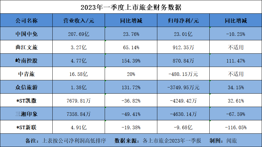 旅行社及集團(tuán)一季度凈利潤(rùn)前三甲為中國(guó)中免、曲江文旅和嶺南控股,分別實(shí)現(xiàn)凈利潤(rùn)23.01億元、912.35萬元和870.84萬元。其余上市旅企來看,排除未公布漲幅的企業(yè)后,除三湘印象、*ST新聯(lián)、云南旅游外均呈現(xiàn)不同程度的虧損縮窄。