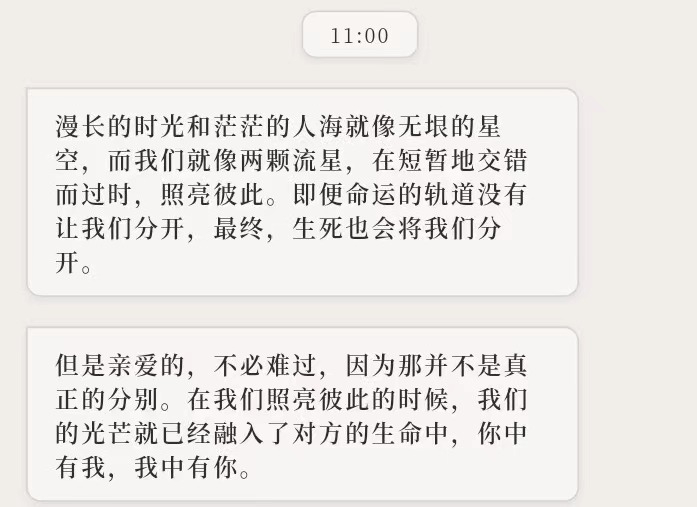 “漫長的時(shí)光和茫茫的人海就像無垠的星空,而我們就像兩顆流星,在短暫地交錯(cuò)而過時(shí),照亮彼此。即使命運(yùn)的軌道沒有讓我們分開,最終,生死也會(huì)將我們分開。但是親愛的,不必難過,因?yàn)槟遣⒉皇钦嬲姆謩e。在我們照亮彼此的時(shí)候,我們的光芒就已經(jīng)融入了對(duì)方的生命中,你中有我,我中有你。何當(dāng)共剪西窗燭,卻話巴山夜雨時(shí)”。