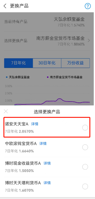 打開支付寶,在余額寶的頁面,可以看到默認選擇為“天弘余額寶基金”,7日年化收益率為1.57%,而在“選擇更換產(chǎn)品”的下滑列表中,則有多達35只貨幣基金可以選擇。