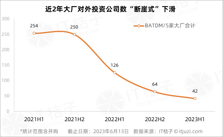 與傳統(tǒng)巨頭不同,互聯(lián)網(wǎng)企業(yè)的投資熱情直線消退。IT 桔子數(shù)據(jù)顯示,騰訊、百度、阿里、字節(jié)/抖音和美團(tuán)5家大廠在 2023 上半年的投資公司數(shù)合計(jì)僅有42家,是去年同期的1/3,同比減少了66%。以騰訊為例,2022年上半年,騰訊投資公司數(shù)為62家、不足2021上半年的一半,2023 H1這個(gè)數(shù)字只有17家。