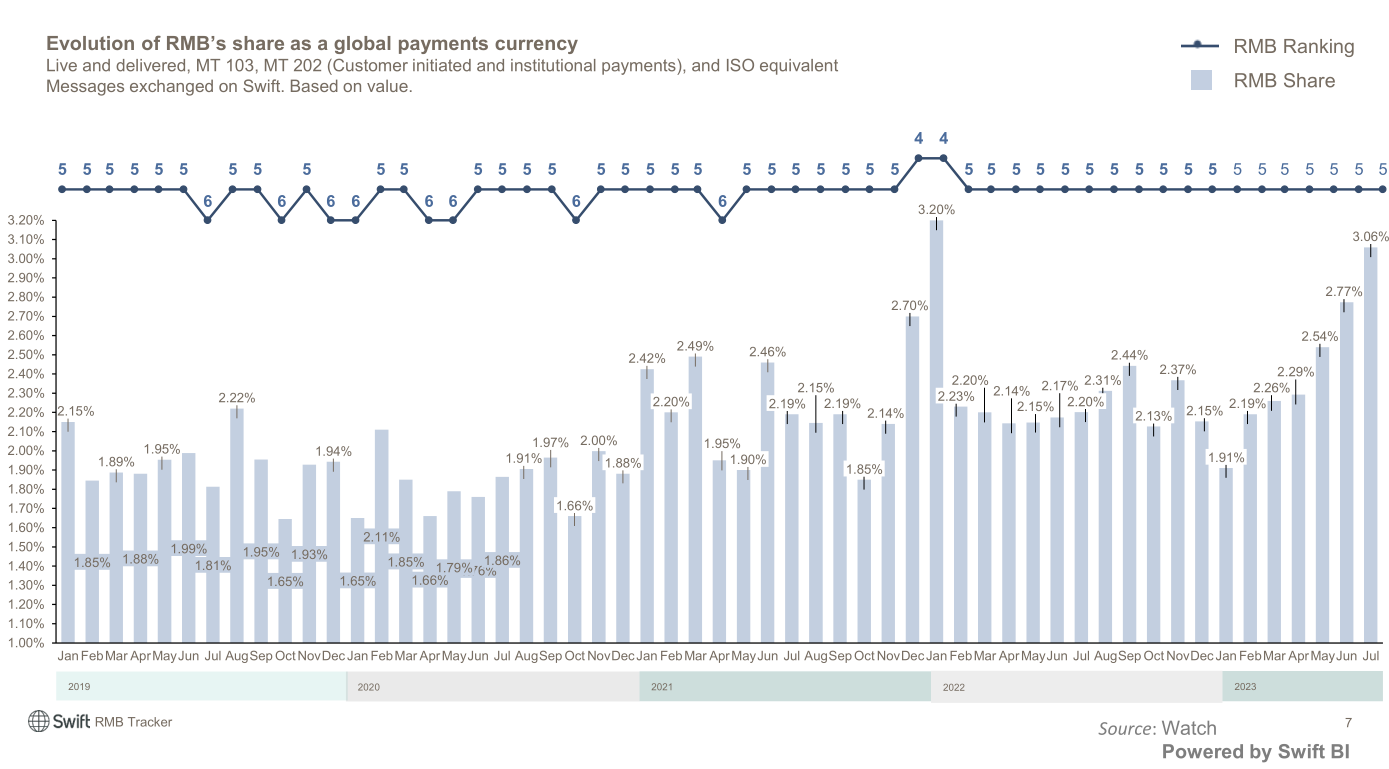 這是有相關(guān)統(tǒng)計記錄以來人民幣全球支付占比第二次超過3%。上次人民幣全球支付占比超過3%是在2022年1月,當(dāng)時份額為3.2%。