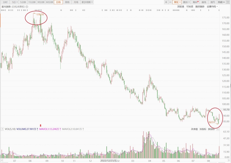 在紫光集團(tuán)重整完成后,紫光國(guó)微股價(jià)于2022年8月10日創(chuàng)新高,觸及250.50元/股(前復(fù)權(quán)為178.70元/股)。在此之后,紫光國(guó)微股價(jià)一路下跌,至今已歷時(shí)一整年,股價(jià)于2023年8月23日跌至低點(diǎn)82.51元/股,跌去53.83%。紫光國(guó)微的超1500億市值距蒸發(fā)掉一半。