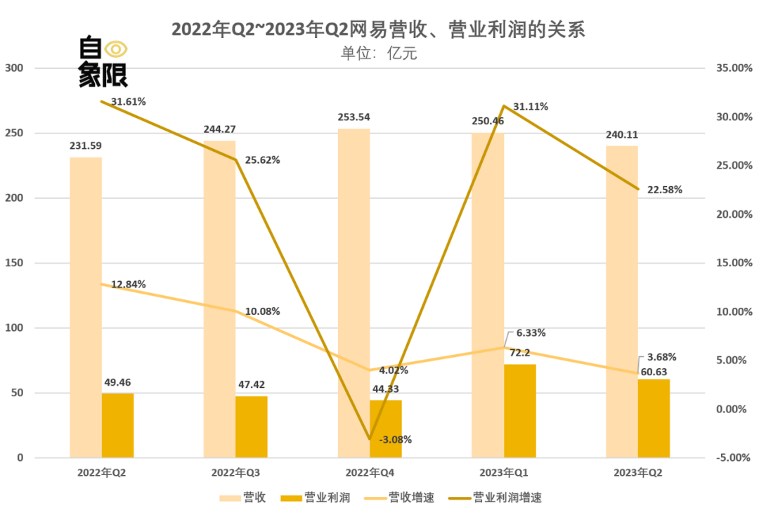 8月24日港股盤(pán)后,網(wǎng)易發(fā)布2023年二季度財(cái)報(bào),營(yíng)收240.11億人民幣,同比增長(zhǎng)3.68%。其中營(yíng)業(yè)利潤(rùn)60.63億,同比增長(zhǎng)22.58%。