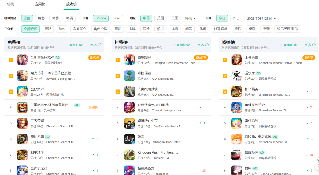 在七麥數(shù)據(jù)的游戲暢銷(xiāo)榜上,排名前20款游戲中網(wǎng)易有6款,分別是排名第2的《逆水寒》、排名第5的《蛋仔派對(duì)》,排名第7的《巔峰極速》、排名第10的《全明星街球派對(duì)》,排名第13的《夢(mèng)幻西游》和排名19的《率土之濱》。