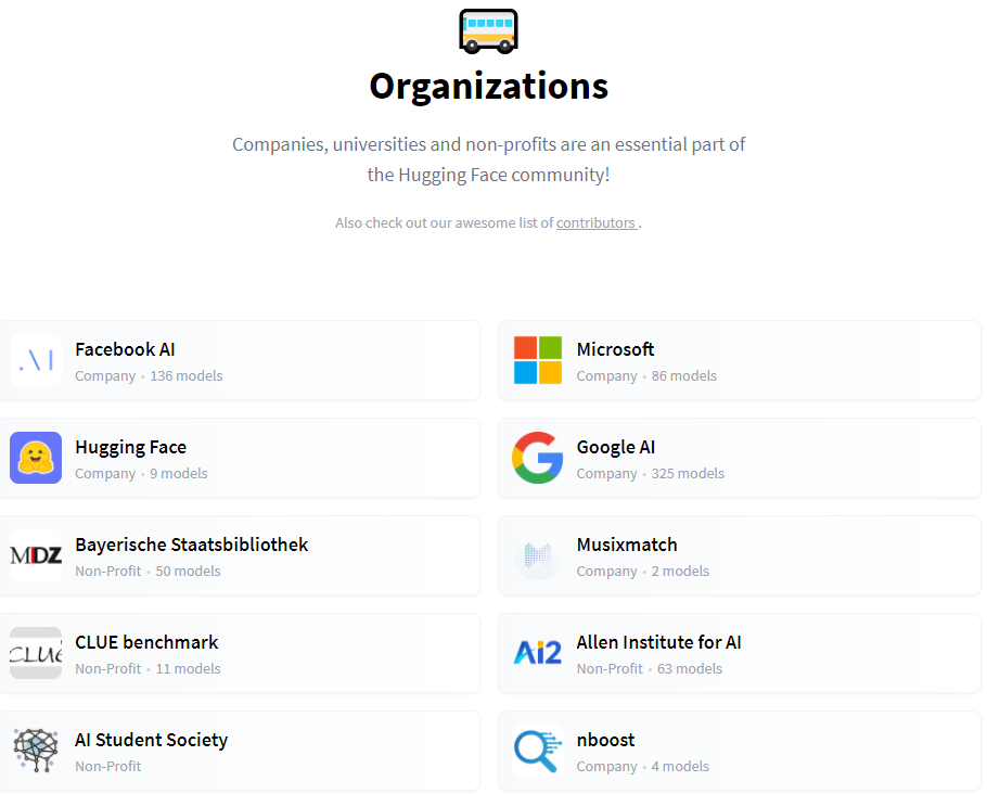 截至 2023 年 6 月1日,Hugging Face 共享了 215,693 個(gè)訓(xùn)練模型,38,085 個(gè)數(shù)據(jù)集,涵蓋 NLP、語音、生物學(xué)、時(shí)間序列、計(jì)算機(jī)視覺、強(qiáng)化學(xué)習(xí)等幾乎所有領(lǐng)域,搭建了全球范圍最完整的 AI 開發(fā)者生態(tài)。而且,F(xiàn)acebook、微軟、Google都是Hugging Face上活躍的模型貢獻(xiàn)者。