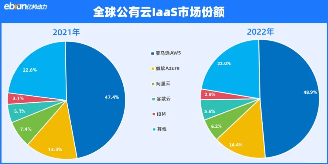 與2021年相比,阿里云市場(chǎng)份額在減少,而亞馬遜和谷歌所占市場(chǎng)份額在增加。